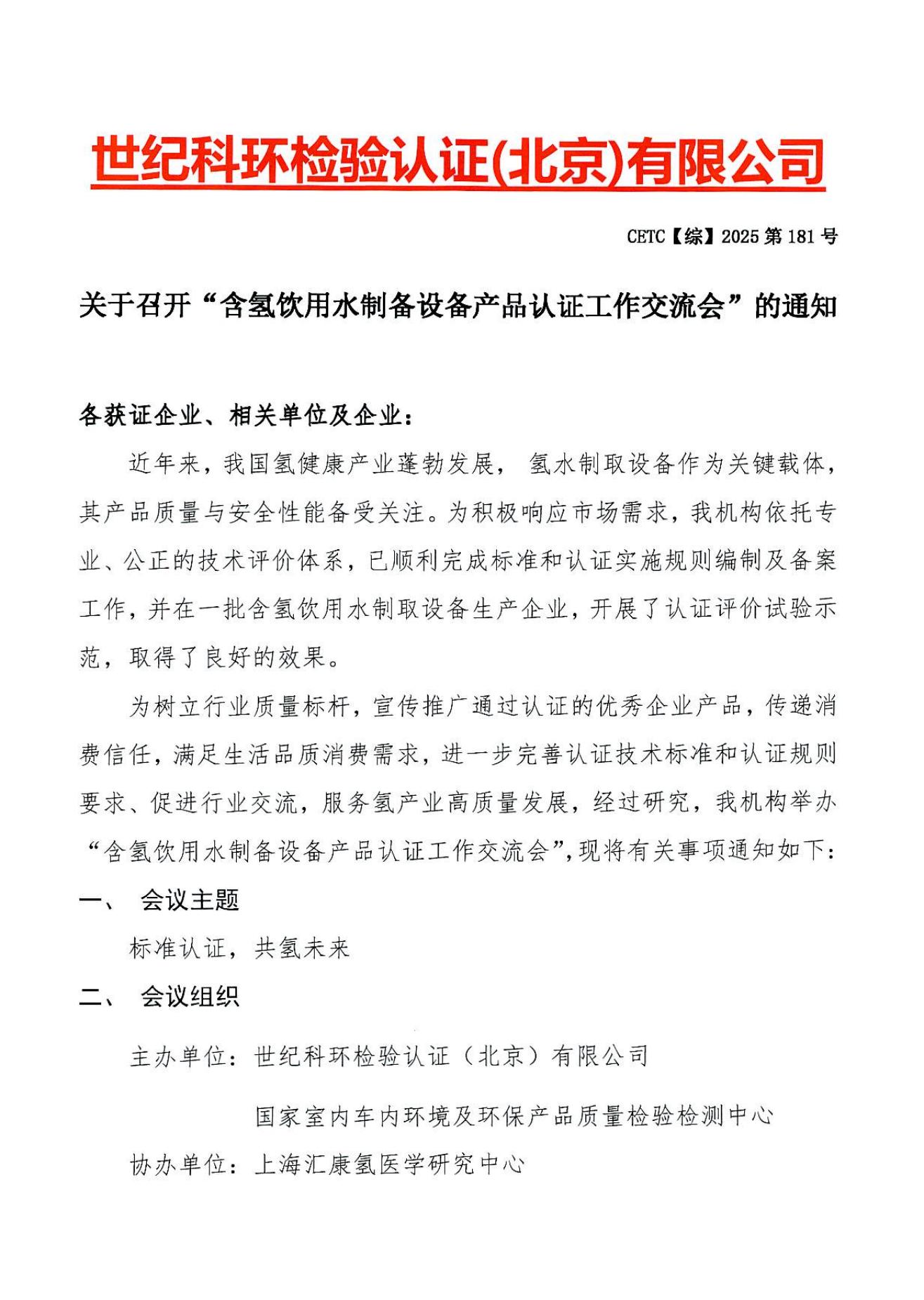 关于召开“含氢饮用水制备设备产品认证工作交流会”的通知