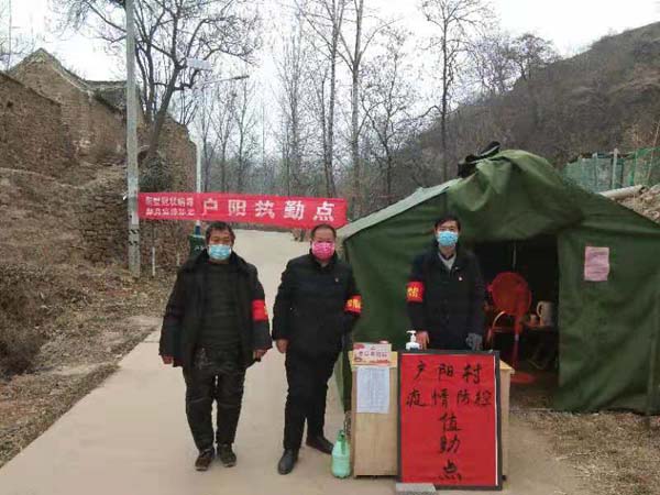 图为扈阳村第一书记王明学,正在带领村内党员和村组干部,在入村通道出入口设岗值守,对出入车辆和人员进行严格检查、登记,全力做好疫情联防联控工作。