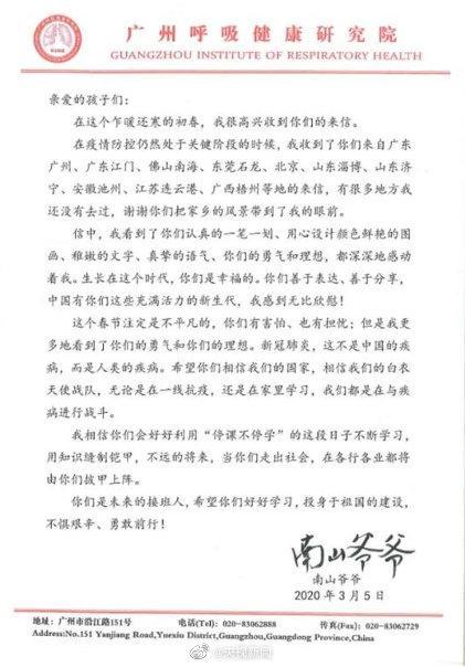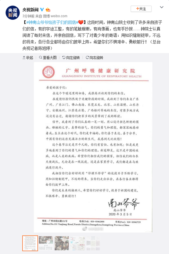这段时间,钟南山院士收到了许多来自孩子们的信,有的字迹工整,有的笔触稚嫩,有肖像画,也有手抄报……钟院士认真阅读了每封来信,并亲自回信,写下了对青少年的寄语:用知识缝制铠甲,不远的将来,各行各业都将由你们披甲上阵。希望你们不惧艰辛、勇敢前行!(总台央视记者陈旭婷)