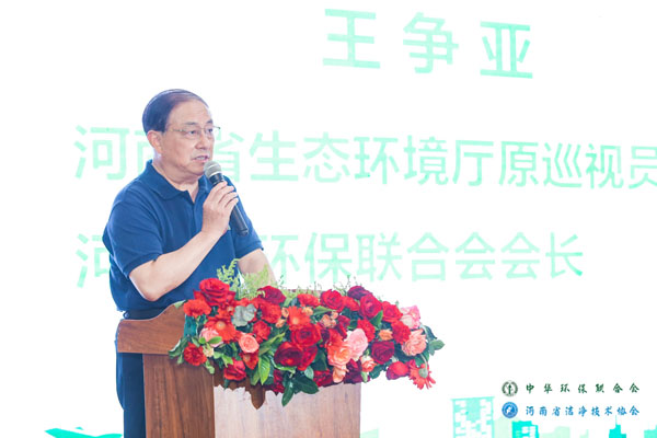 河南省环境保护厅原副厅长兼巡视员、河南省环保联合会会长王争亚致辞并倡导进一步增强全社会生态文明意识,营造绿色、环保、高质量发展的社会氛围,弘扬社会正能量,共同建设美丽中国,让河南更加出彩!