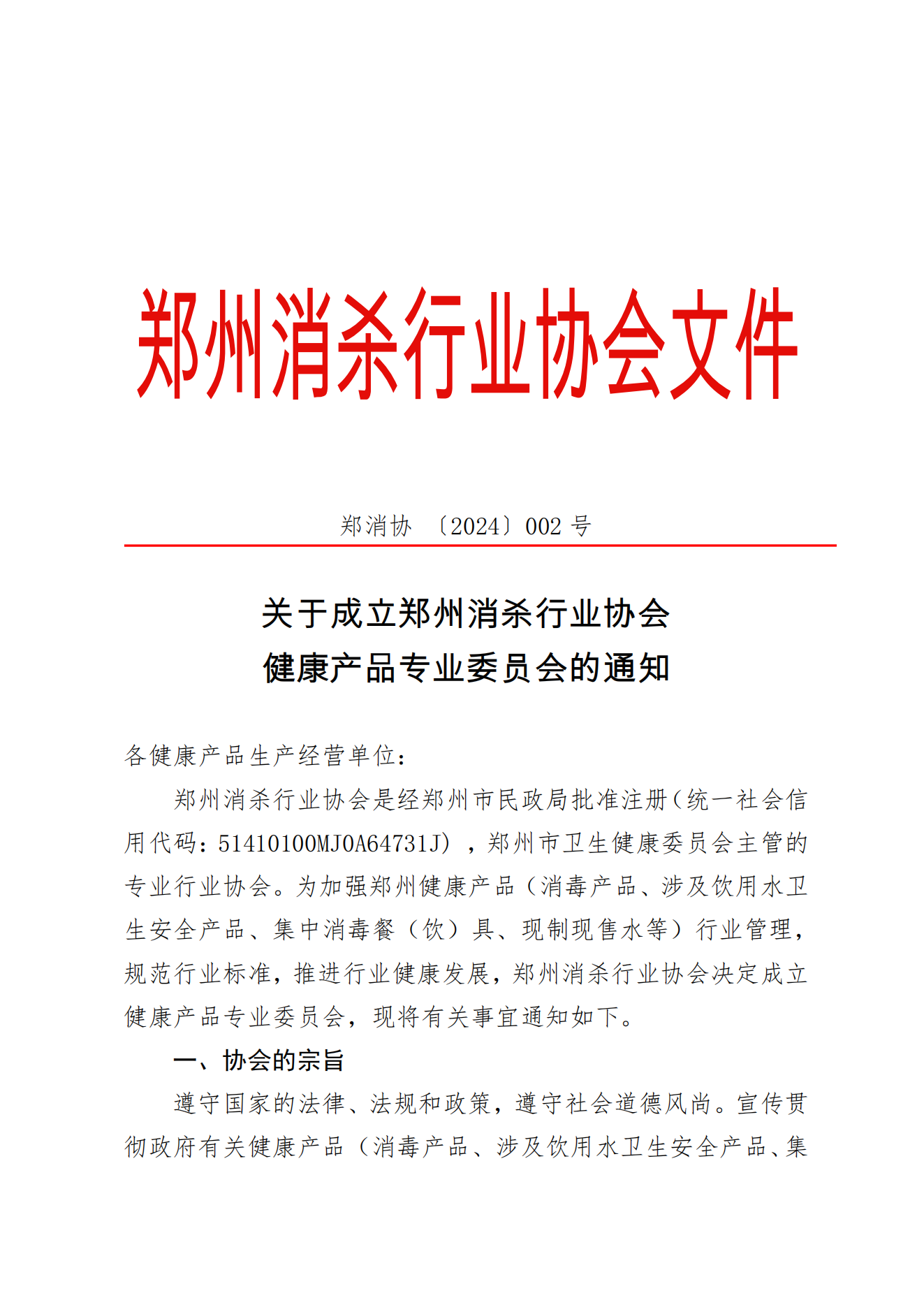 关于成立郑州消杀行业协会健康产品专业委员会的通知