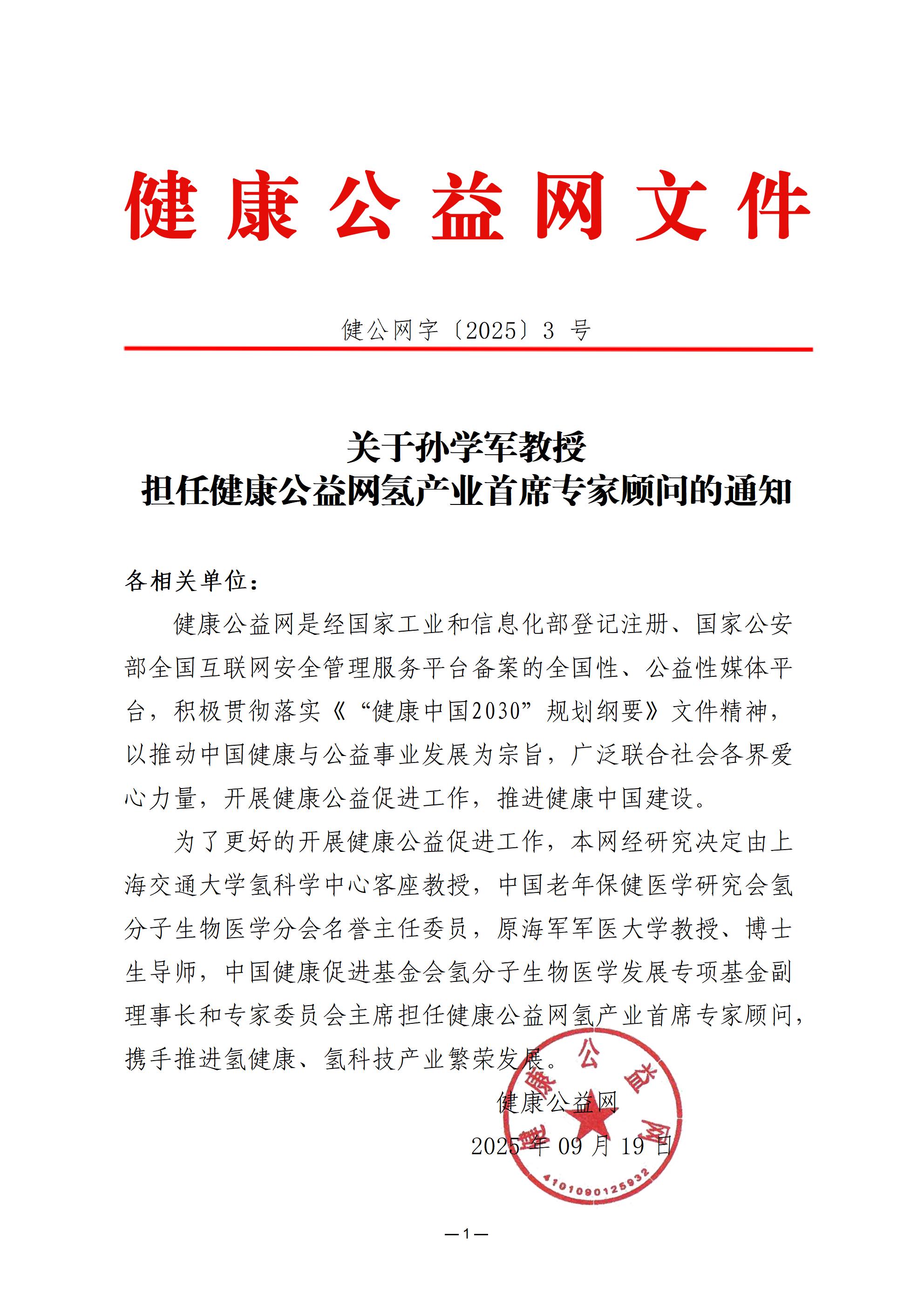 孙学军,健康公益网氢产业首席专家顾问,上海交通大学氢科学中心客座教授,中国老年保健医学研究会氢分子生物医学分会名誉主任委员,原海军军医大学教授、博士生导师,中国健康促进基金会氢分子生物医学发展专项基金副理事长和专家委员会主席。长期致力于氢气生物医学科普宣传和健康促进领域的应用推广。